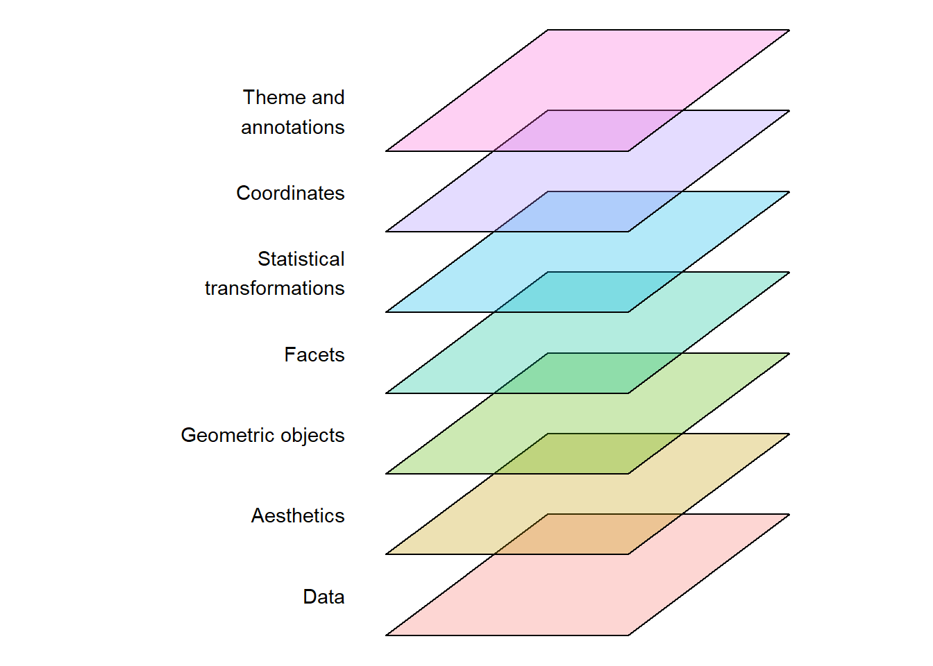 The underlying data contains the variables that are mapped to aesthetics such as coordinates, colors, or shapes. Each aesthetic can be controlled through scales by assigning values to coordinates, colors, shapes, etc. Geometric objects create the visual representations of the mapping. Sometimes small multiples of the same graph are created using facets, which creates a subdivision of the data to be plotted in different panels. Statistical transformations create summaries of the data, however, in its simplest form, the transformation is the identity transformation. All graphical representations are plotted in a coordinate system. Theme and annotations adds non-data layers to the plot, which can include geometric shapes or text (Figure 1.1).