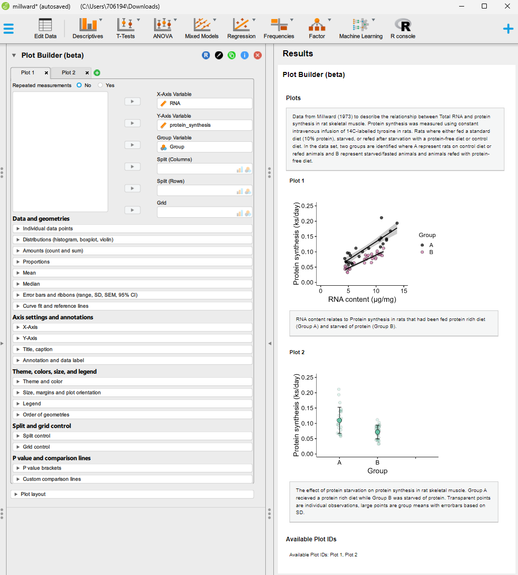 Also in the Descriptives module, Plot builder and Flexplot allow for data visualizations. Plot builder is the more advanced of the two. In Plot builder we are able to add variables to x- and y-coordinates of the figure. A grouping variable can be used to separate categories present in the data. Axis and plot annotations can be added to the figure, and aggregation can be done by plotting the mean, median, and error bars. Furthermore, simple curve fitting can add results from a statistical model to the plot.
