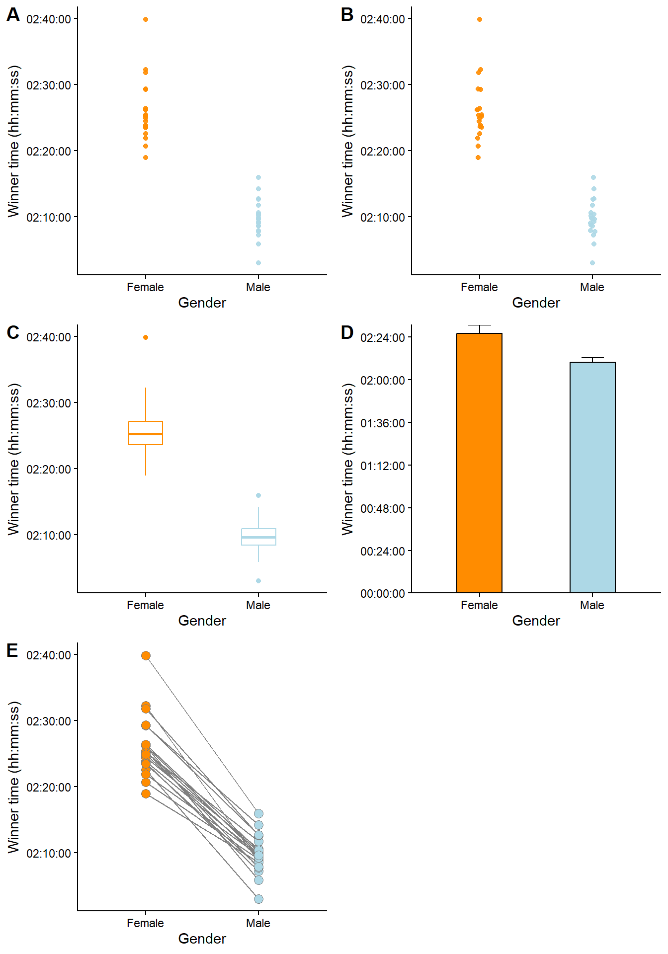 By replacing a continuous variable on one axis with a categorical variable, we get a visualization suitable for comparisons. When the purpose of a graph is to highlight differences between categories (or associations between a categorical variable and a continuous variable), we could use a variation of a basic scatter plot, as shown in Figure 4.3. However, some designs are better than others. The first panel (A) uses simple points to represent each observation (winner time per year). A slight jitter (panel B) makes it easier to see the individual points. Aggregated data removes the information gained from seeing variation between individual data points, as in panel C, where box-plots represent time per gender, or as in D, where the data has been reduced to a mean (the bars) and a standard deviation (the whiskers). The bar plot (D) is particularly bad, as most of the bar does not contain any actual data; there are no observations from zero to about 2 hours. To highlight the paired nature of the data, we could connect observations done in particular years (as in panel E). From this, we can learn that the winning times are consistently lower in males compared to females. Even though there is some overlap between genders, no year contains data where females ran faster than males.