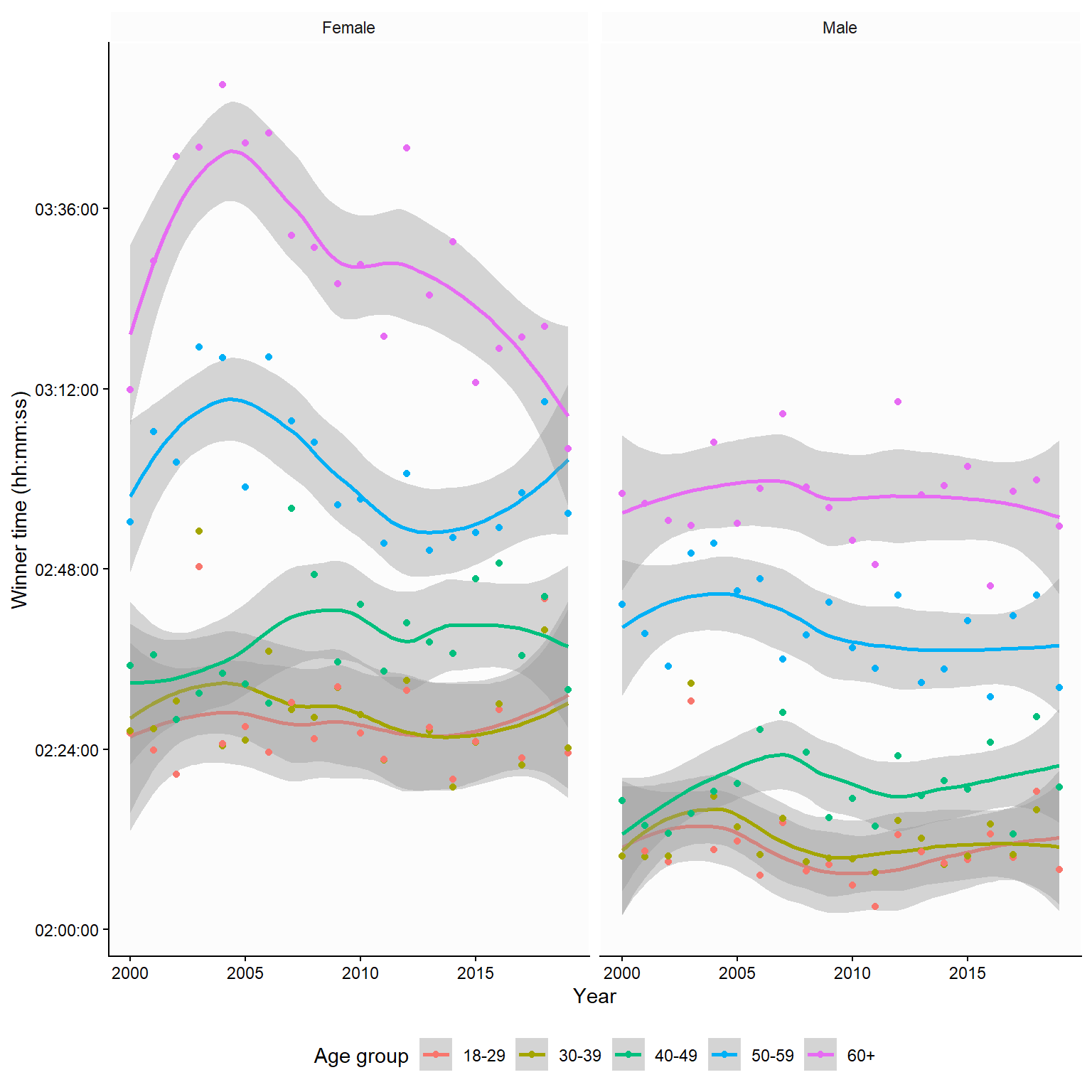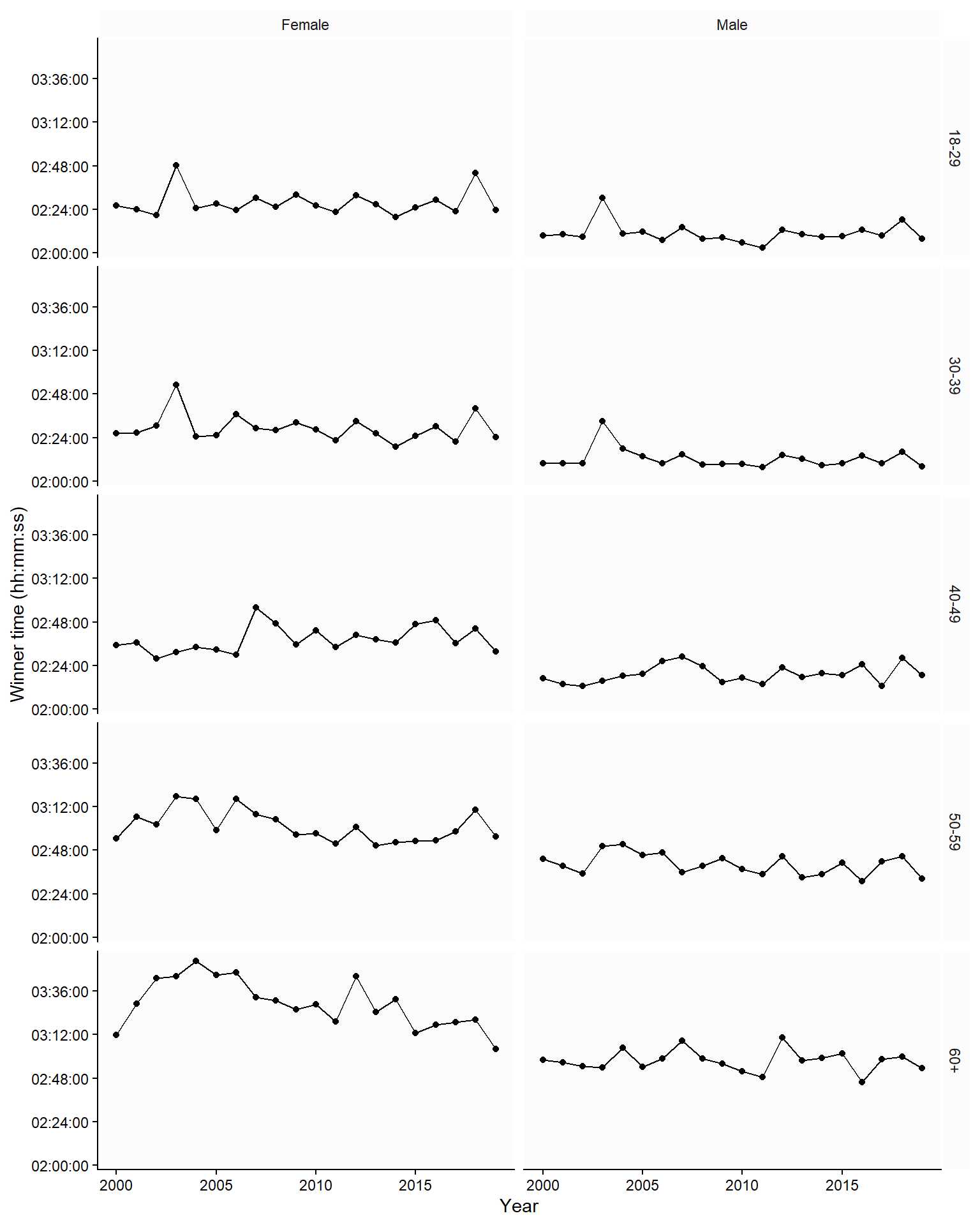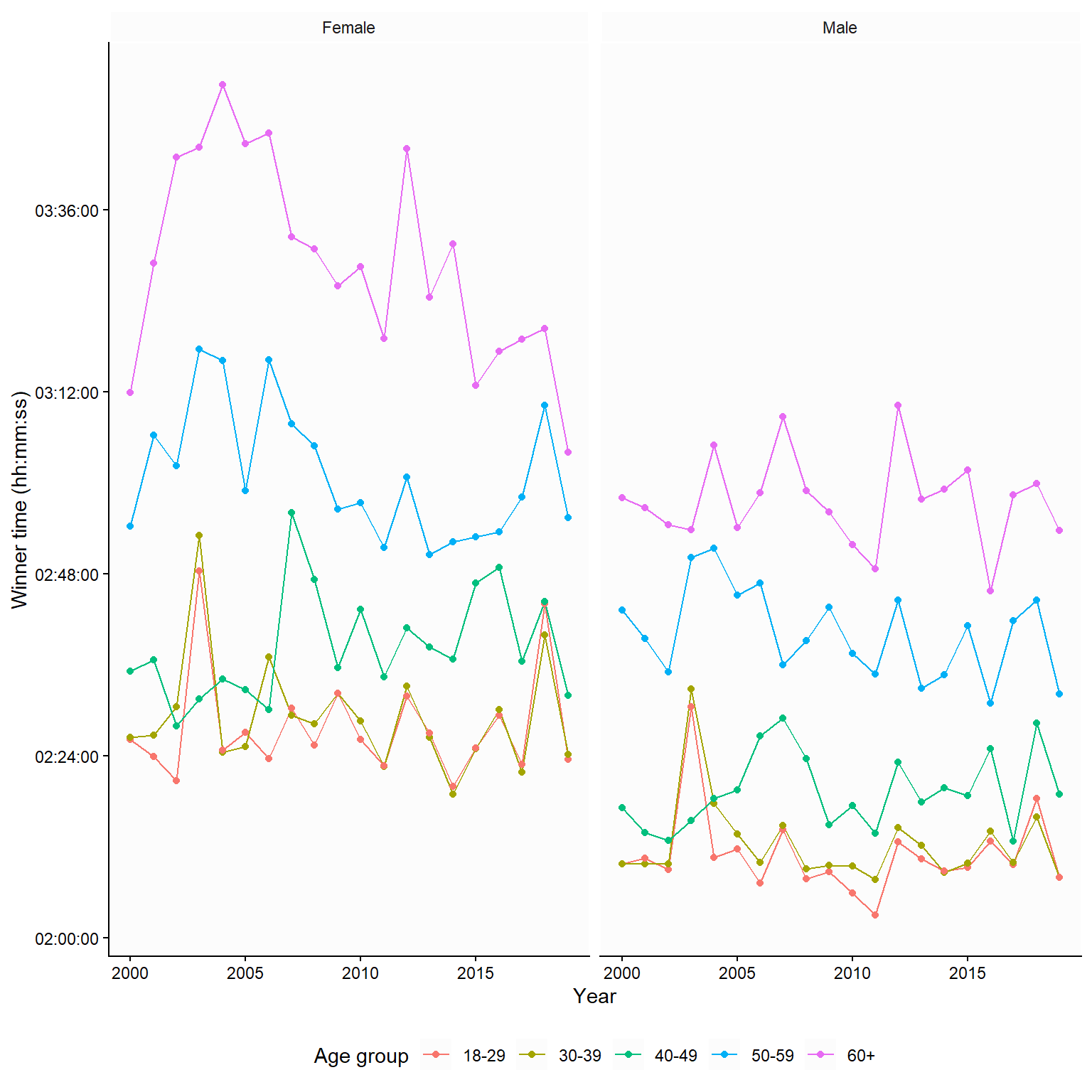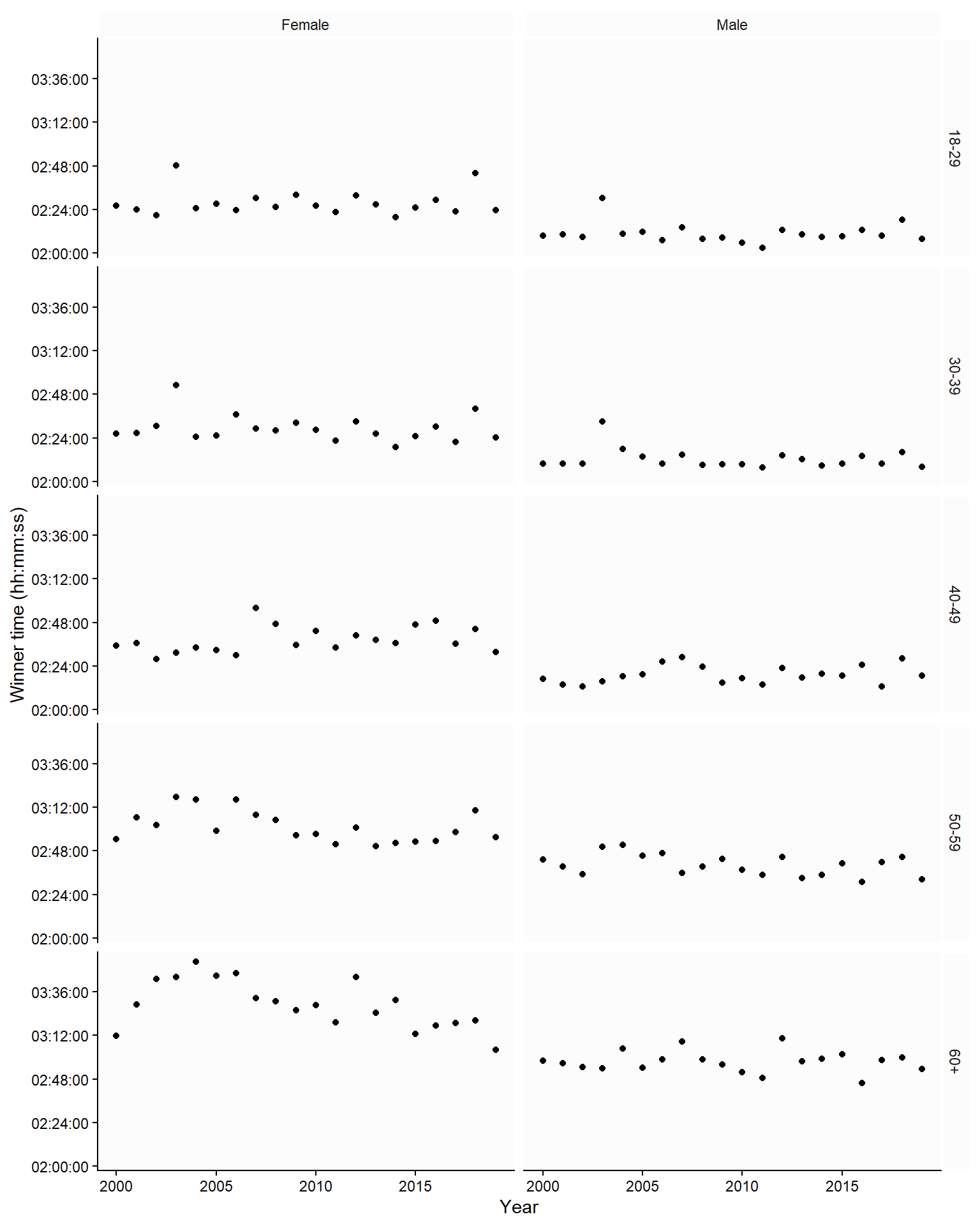 In Figure 4.5, we used a time series of winning times in the Boston Marathon. The trend over time was not highlighted; to do this, we could add a line to produce line graphs. In Figure 4.6, the graph implies that we are comparing females to males in each age category, as we use the same y-axis for both genders in each age group. An alternative comparison would be the age-group comparison. To highlight this comparison, we could plot each age group using the same y-axis (Figure 4.7).