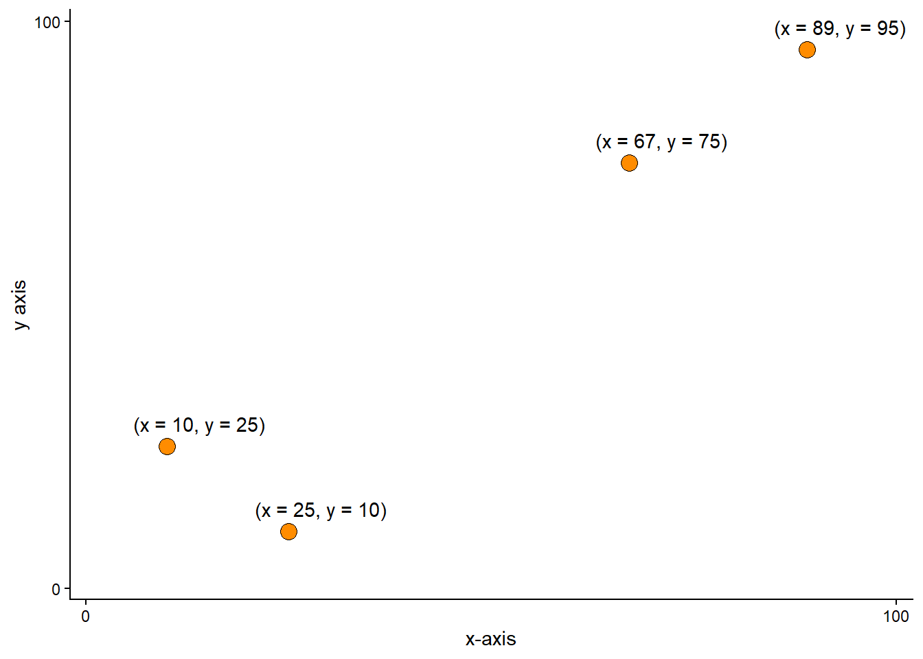 A basic data visualization uses a coordinate system to display data along measurement scales. The x- and y-axis form a basic template for a two-dimensional display (two variables) of data. The scales for the x- and y-axis could be numerical and continuous or categorical. In the figure below, two continuous measurements are mapped to the x- and y-axis. Each observation has a value for each axis, making it possible to plot them in the two-dimensional coordinate system (Figure 4.1).