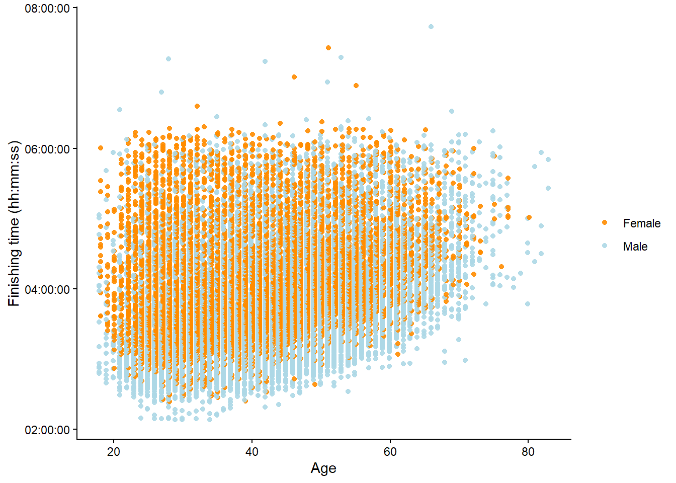 The above figure is called a scatter plot. The scatter plot is a powerful tool to visualize an association between two variables. The association becomes evident when a pattern emerges from plotting two variables together. When plotting the variables Age and finishing time in the Boston Marathon, we can clearly see a pattern, as maximal running velocity decreases with age. We have added a third dimension to the figure by giving different colors to males and females (Figure 4.2).