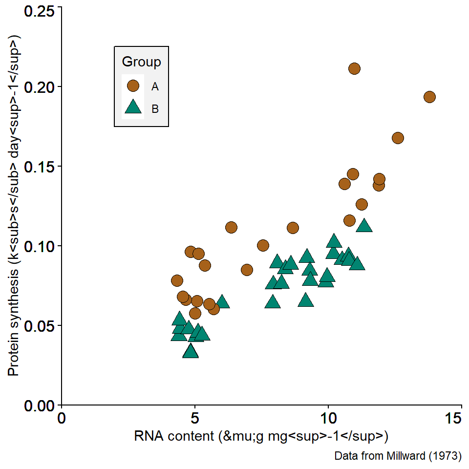 In the above figures, we have already added a variable by assigning colors to highlight two groups. Using colors and shapes is a way to add multiple dimensions to a plot. In Figure 4.4, two different colors and shapes are assigned to two categories in the data. This allows us to plot additional variables. The additional variable is explained by a legend shown in the plot.
