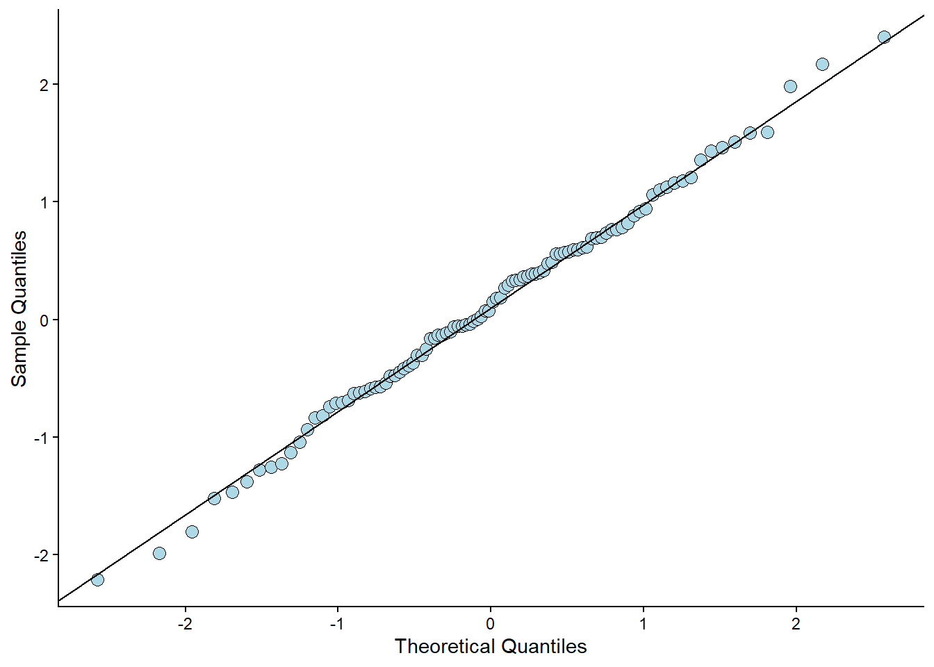 The code above samples 100 observations. They are plotted against their “theoretical values”. If the values (points) follow a straight line, we have data that follows a normal distribution. This can also be assessed from our fitted model (Figure 6.7).