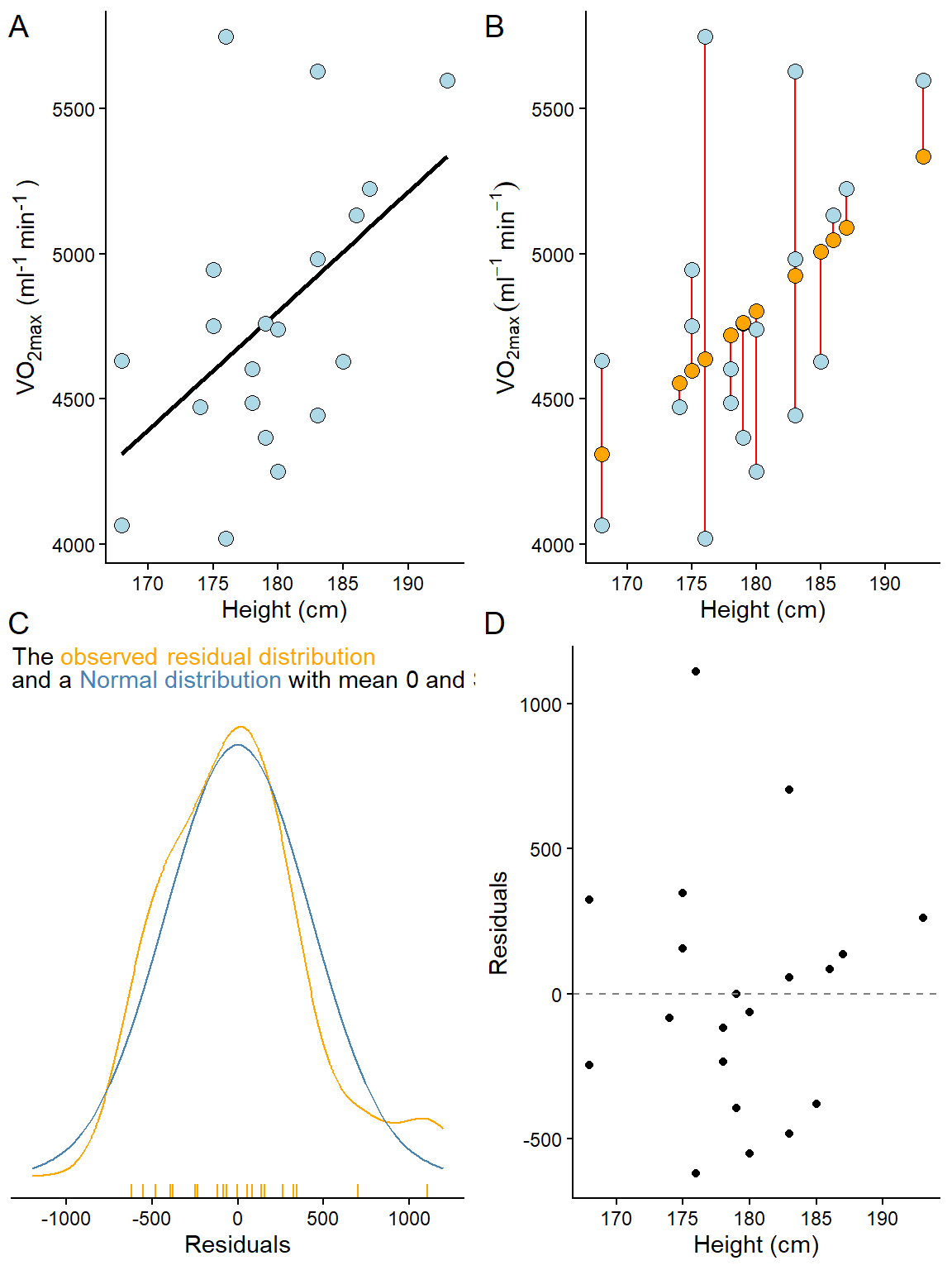 Linear relationship. In the basic case, we expect a trend that can be described with a straight line. If the relationship is curve-linear, we may adjust the fit using, e.g., polynomials (more on this later). The relationship between Height and VO2max is plotted in Figure 6.5 A and highlighted with a best fit line.