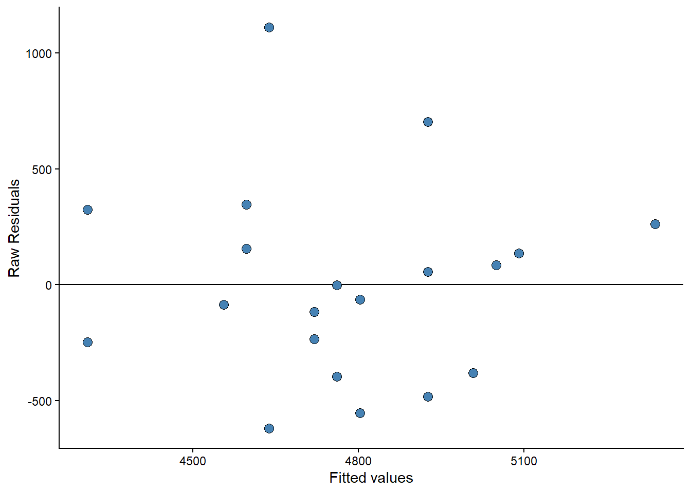 We will plot the fitted values against the residuals. If the model is equally wrong throughout the fitted values (or the predictor values, as in Figure 6.5 D), we have homoscedasticity. The residual plot should not show any obvious patterns.