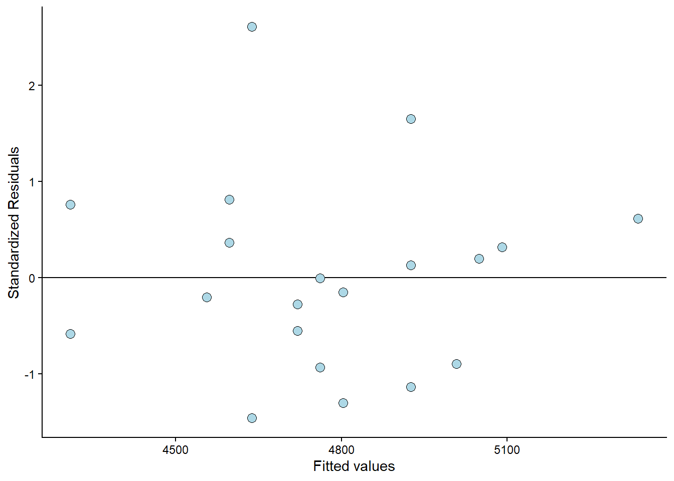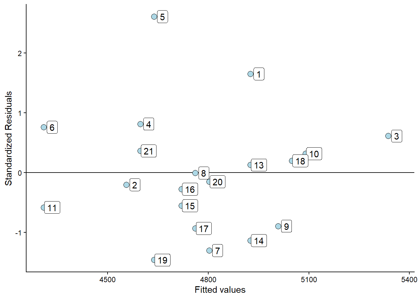 Examining the plot (Figure 6.10) reveals that the observation with the most significant error is approximately 2.5 standard deviations away from its predicted value. We are somewhat limited by the small amount of data available here. But the residual plot does not invalidate the regression model.