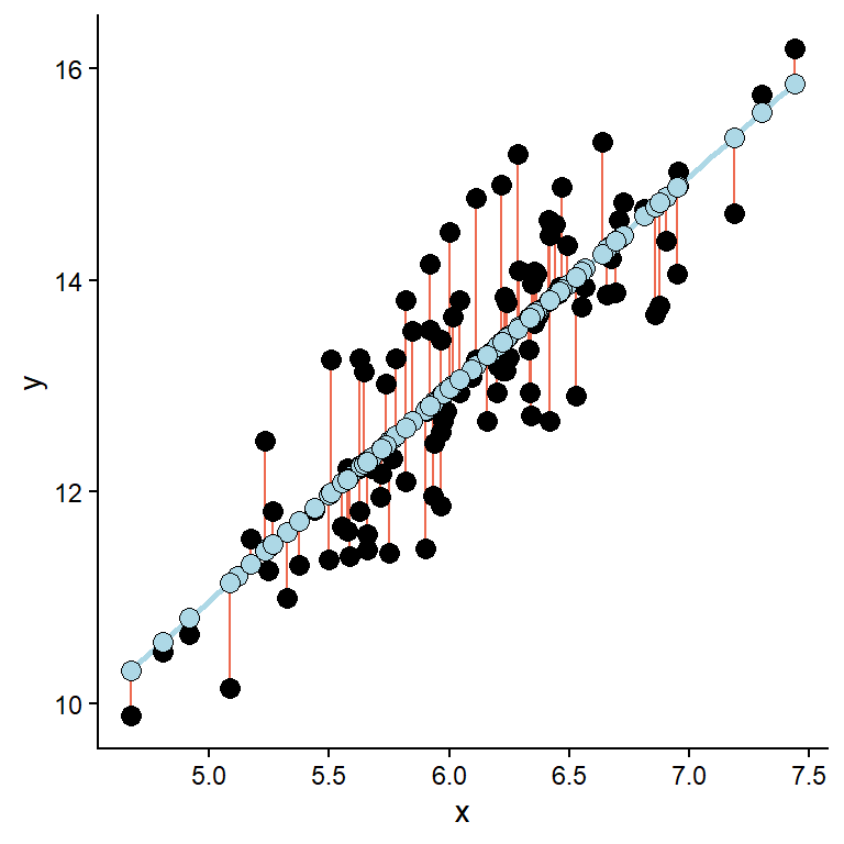 \[\sum\limits_{i=1}^{n}\epsilon_i^2 = \sum\limits_{i=1}^{n}(y_i - \hat{y}_i)^2\] When the above expression is minimized we have the best fitting model. As noted above, real data do not follow the straight line, instead it contains some additional variation making each observation deviate from the general trend, as shown in Figure 6.2.