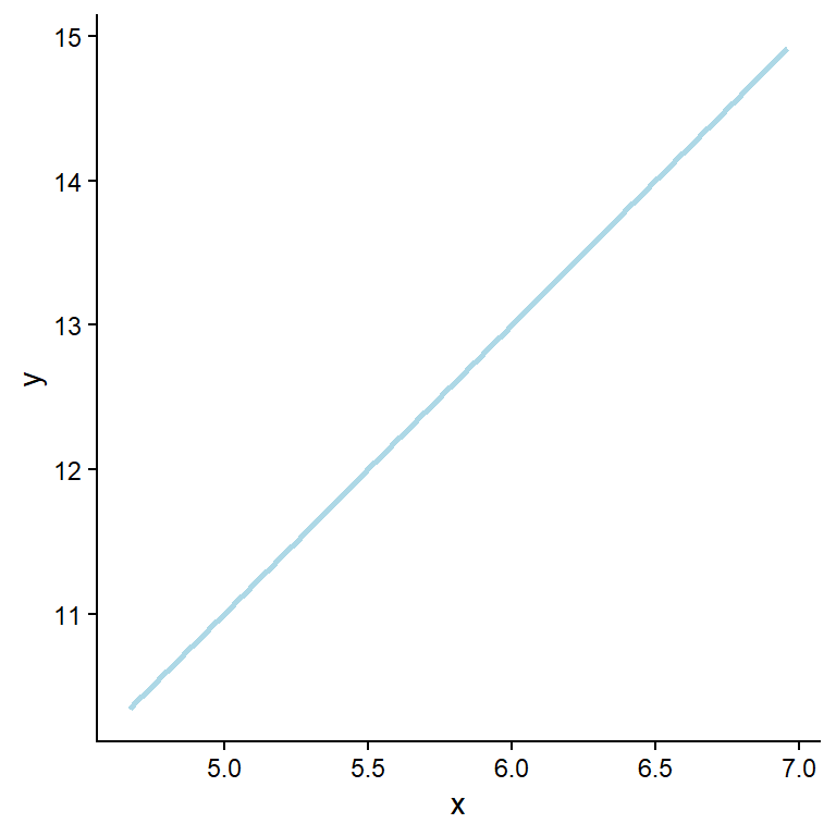 \[ \begin{align} y &\sim \operatorname{Normal}(\mu,~\sigma) \\ \mu &= \beta_0 + \beta_1 x \end{align} \] This notation offers two key advantages: it explicitly adds an assumption to the description of our model, namely that we view the outcome variable (\(y\)) as normally distributed given each specific value of \(x\) with a constant variation (\(\sigma\)) around the mean (\(\mu\)). Second, compared to adding a specific error term (\(y = \beta_0 + \beta_1x + e\)), the model formulation can be extended to other distributions (such as binomial for logistic regression or Poisson for count data), forming the foundation of generalized linear models. This is all very technical, and the benefits are not immediately apparent in simple examples, but preparing for more complex models will save us from later headaches.