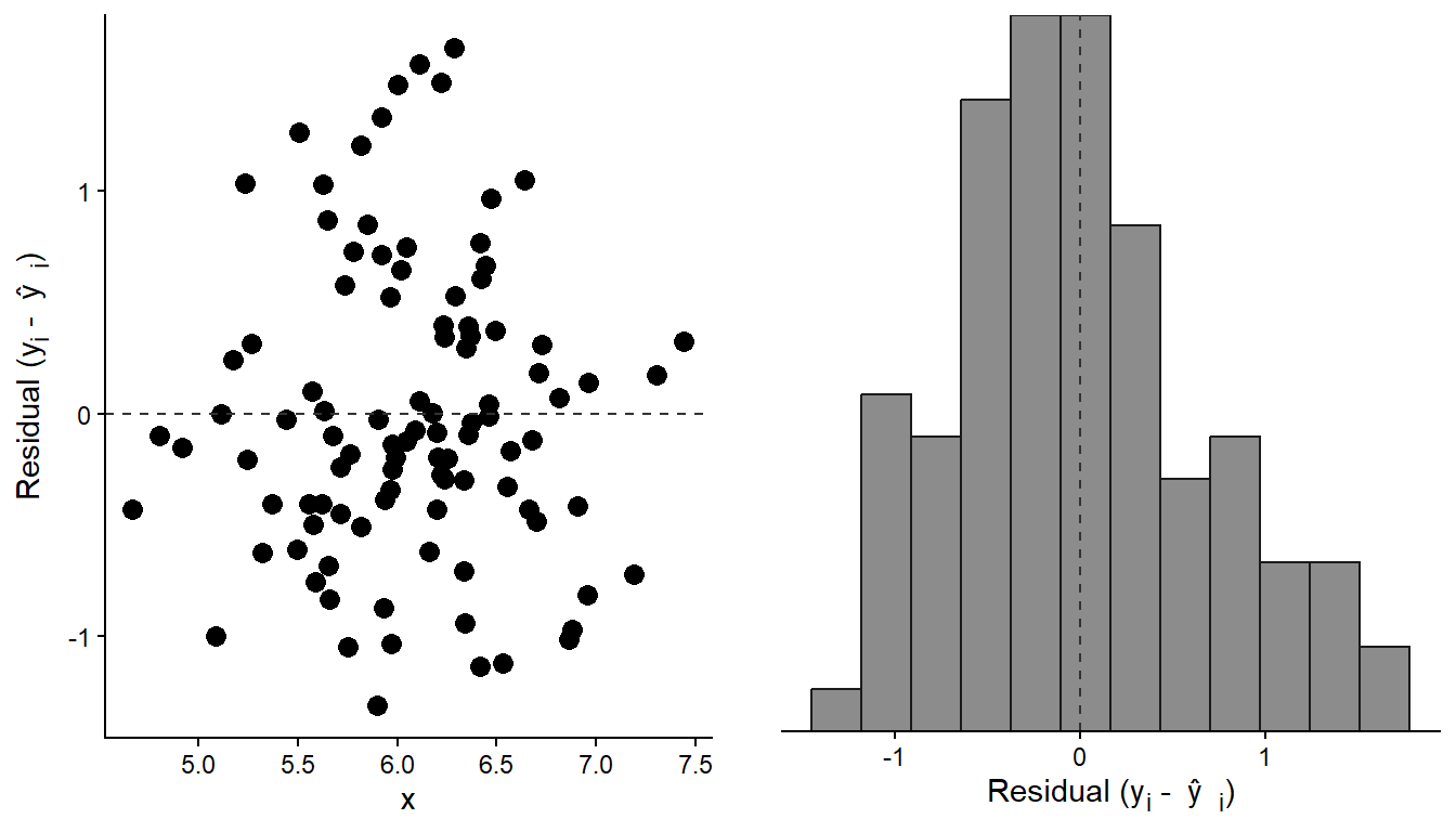 Constant variance. This assumption states that we want to be equally wrong across the entire range of the explanatory variable. If we predict \(y\) with greater error at large \(x\), we have heteroscedasticity (unequal variance); if we are “equally wrong”, we have homoscedasticity (equal variance). Residuals from a model of the relationship Height and VO2max are plotted in Figure 6.5 D against the predictor variable (Height).