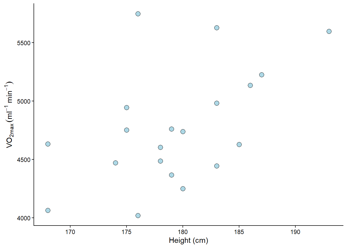 Let’s fit some real data. We are using the cyclingstudy dataset (see Table 1; also available in the exscidata package), and we might wonder if there is some characteristic that is related to VO2max. For example, do taller individuals have greater VO2max? It is always a good idea to start with a plot before we do the modelling (Figure 6.4).