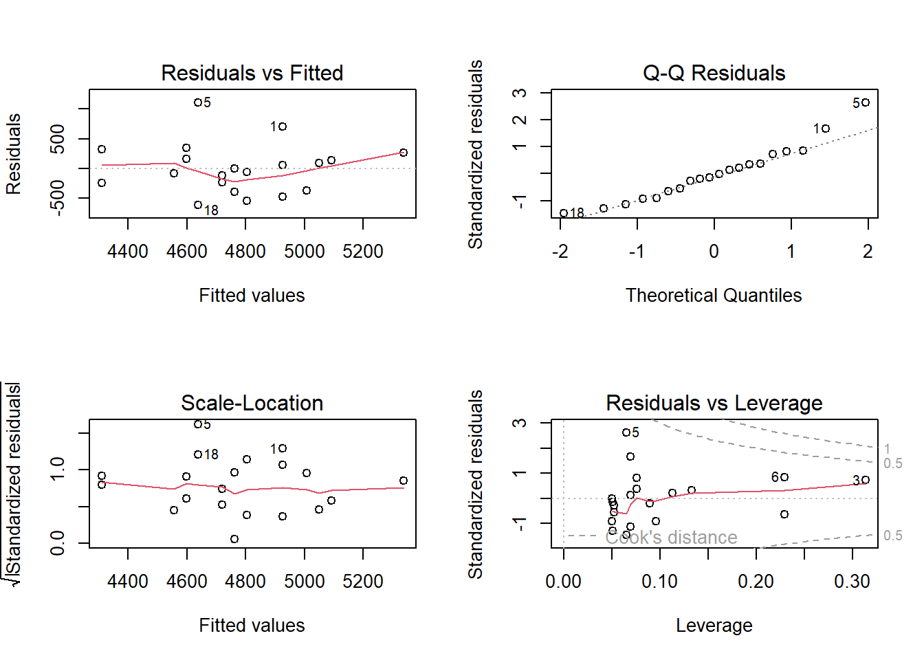 Scale location similarly to the residual plot, we can assess assumptions of heteroscedasticity, and if we find a trend in the data. We are looking for a straight, flat line and points equally scattered around it.
