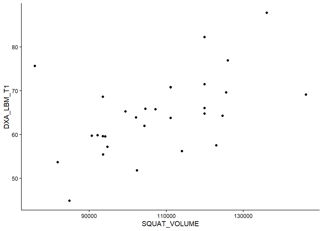 data: dat$DXA_LBM_T1 and dat$SQUAT_VOLUME