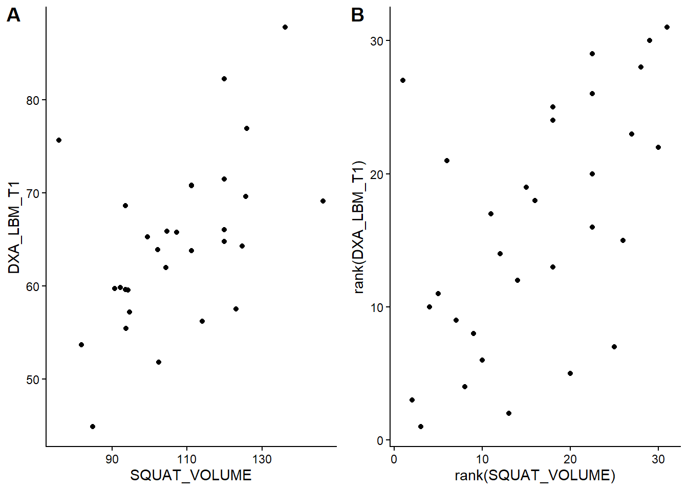 library(cowplot)raw <- dat %>%ggplot(aes(SQUAT_VOLUME, DXA_LBM_T1)) +geom_point() +theme_classic()rank <- dat %>%ggplot(aes(rank(SQUAT_VOLUME),rank(DXA_LBM_T1))) +geom_point() +theme_classic()plot_grid(raw, rank, labels =c("A", "B"))