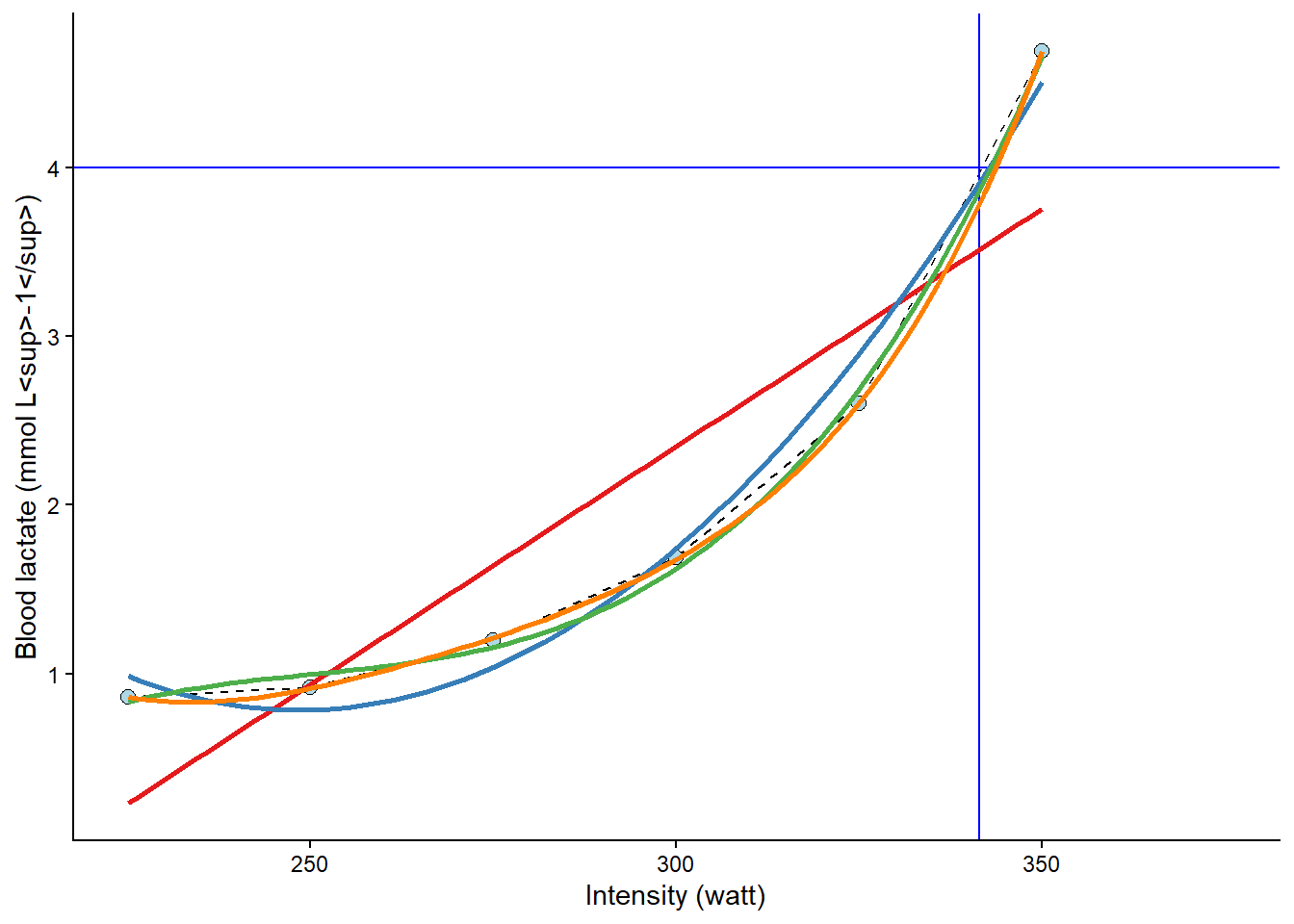 This bends the line to better fit the data points. As we can see in the resulting plot (Figure 8.5), the different models are not that different around the 4 mmol L-1 mark. However, the linear model (\(\beta_0 + \beta_1x\)) is just wrong at around 300 watts, and the second-degree polynomial model (\(\beta_0 + \beta_1x + \beta_2x^2\)) is wrong at 275 watts. The third and fourth degree polynomial model does not differ much from observed values or each other (\(\beta_0 + \beta_1x + \beta_2x^2 + \beta_3x^3\) and \(\beta_0 + \beta_1x + \beta_2x^2 + \beta_3x^3 + \beta_4x^4\)).