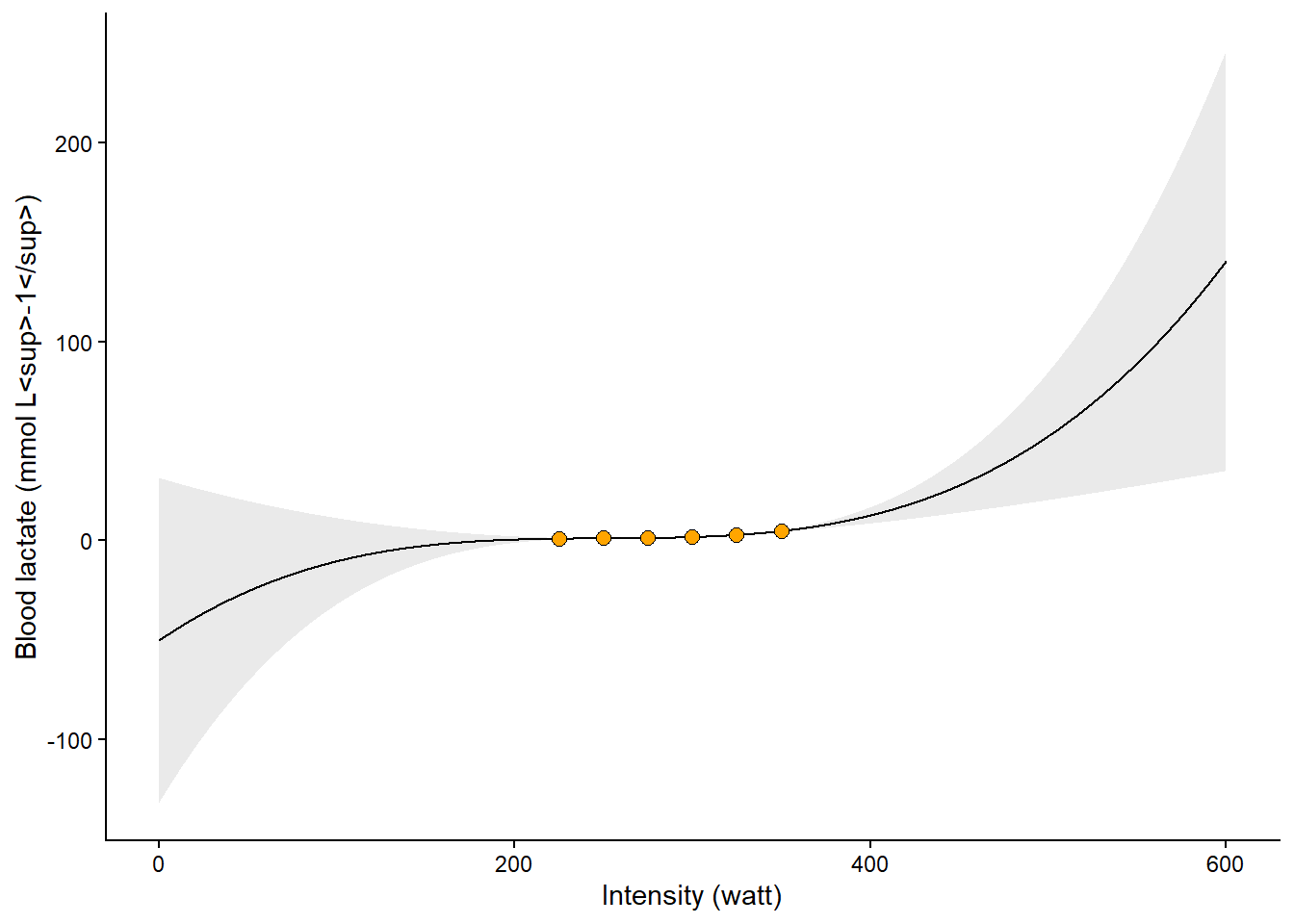 In the application discussed above, modeling the relationship between work intensity and blood lactate, the polynomial model performs well. However, the polynomial regression model estimates parameters to best fit the data we have observed. This means that outside the range of the observed data, we should instead expect the model to predict very unexpected values. In Figure 8.7 we can see that the model (a third-degree polynomial) predicts implausible values (< 0 mmol L-1) at plausible intensity values (watt > 0). This is a general lesson from fitting regression models. However, more flexibility in the curves can lead to increasingly poor predictions outside the range of the data.