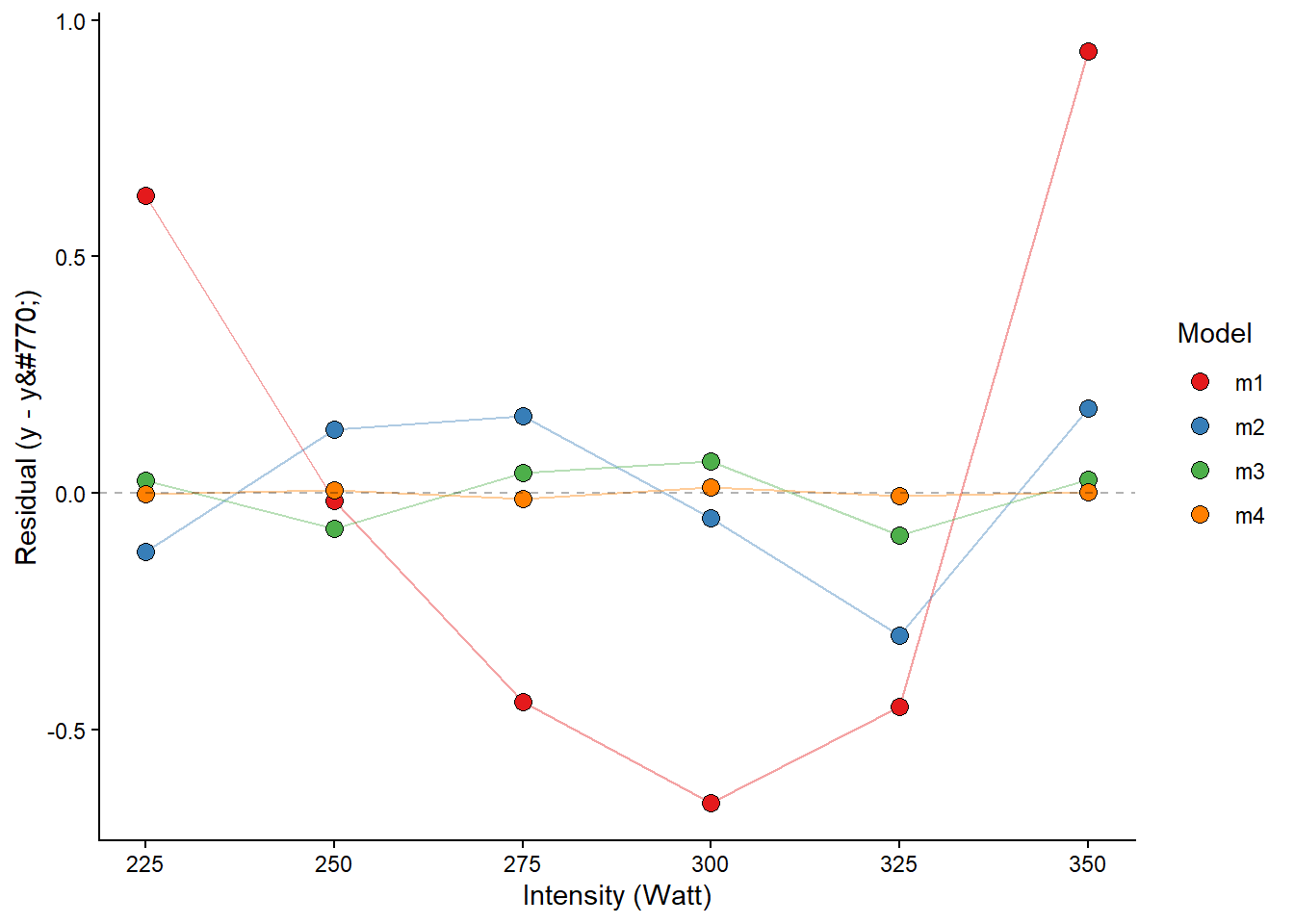 The fourth-degree polynomial model best fits the observed values, followed by the third-degree model. This is not strange, as the polynomial model with increased degrees has more flexibility to fit the data. The problem with polynomial models is that you cannot fit a fourth-degree polynomial model with only four data points. You may also have a model that is more sensitive to, for example, a bad measurement. Let’s settle for the third degree model.