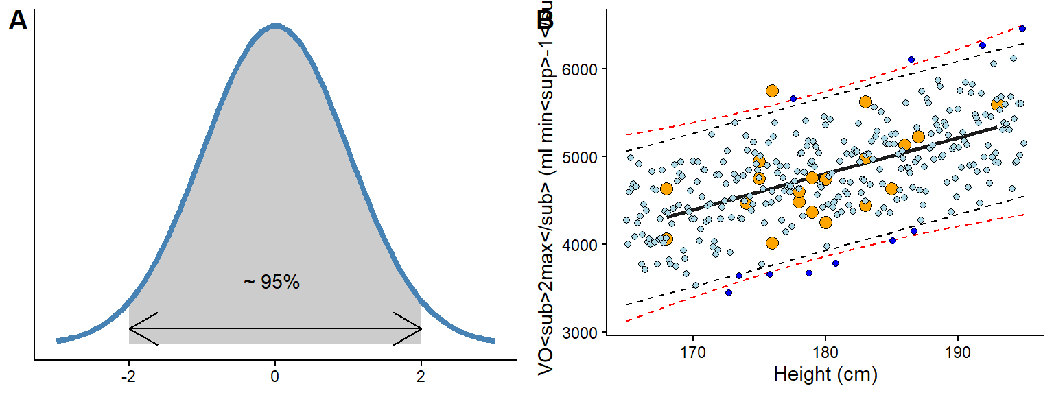 Where \(\hat{\mu}\) and \(\hat{\sigma}\) are the mean and standard deviation of a normal distribution estimated from the data. Multiplying \(\sigma\) by 2, approximately gives us 95% of possible values of the normal distribution (Figure 8.1 A). By simulating data from the model, we can get a sense of what the model predicts. About 95% of the predicted values will fall inside the 95% prediction interval.