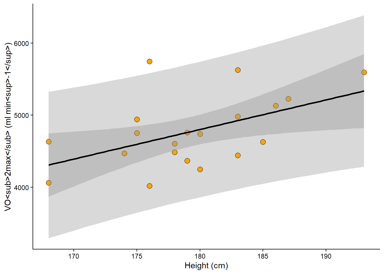 As a first step, it is a good idea to get a visual representation of the prospective model. In the code chunk below, we load the cyclingstudy data set from the exscidata package and also load tidyverse. We then plot the relationship between height and VO2.max. In the ggplot call, a good starting point is to use geom_point together with geom_smooth, which will produce a scatter plot with a best-fit line. Notice that method = "lm" and se = FALSE are being used to make sure you get a straight line (method = "lm") and no confidence bands (se = FALSE). Copy the code into your own document and run the code.