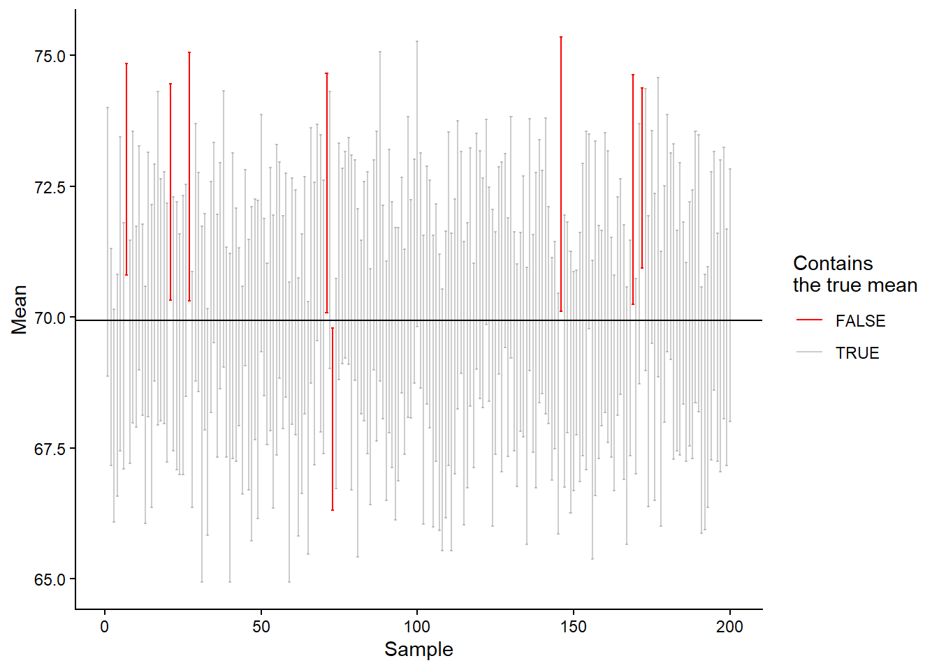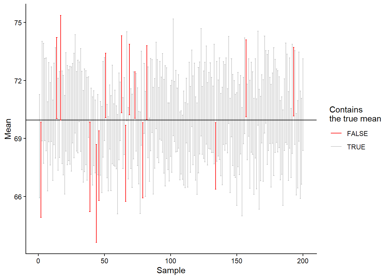 The interpretation of the confidence interval is that, in repeated sampling, 95% of confidence intervals will contain the population mean. Unfortunately, we do not know whether our specific interval does so. The interpretation follows from the fact that we estimate the variation in the theoretical sampling distribution. Five percent of the time, we will be wrong. To test whether the theory is correct, let’s calculate confidence intervals from our simulated data and see how often we capture the true mean.