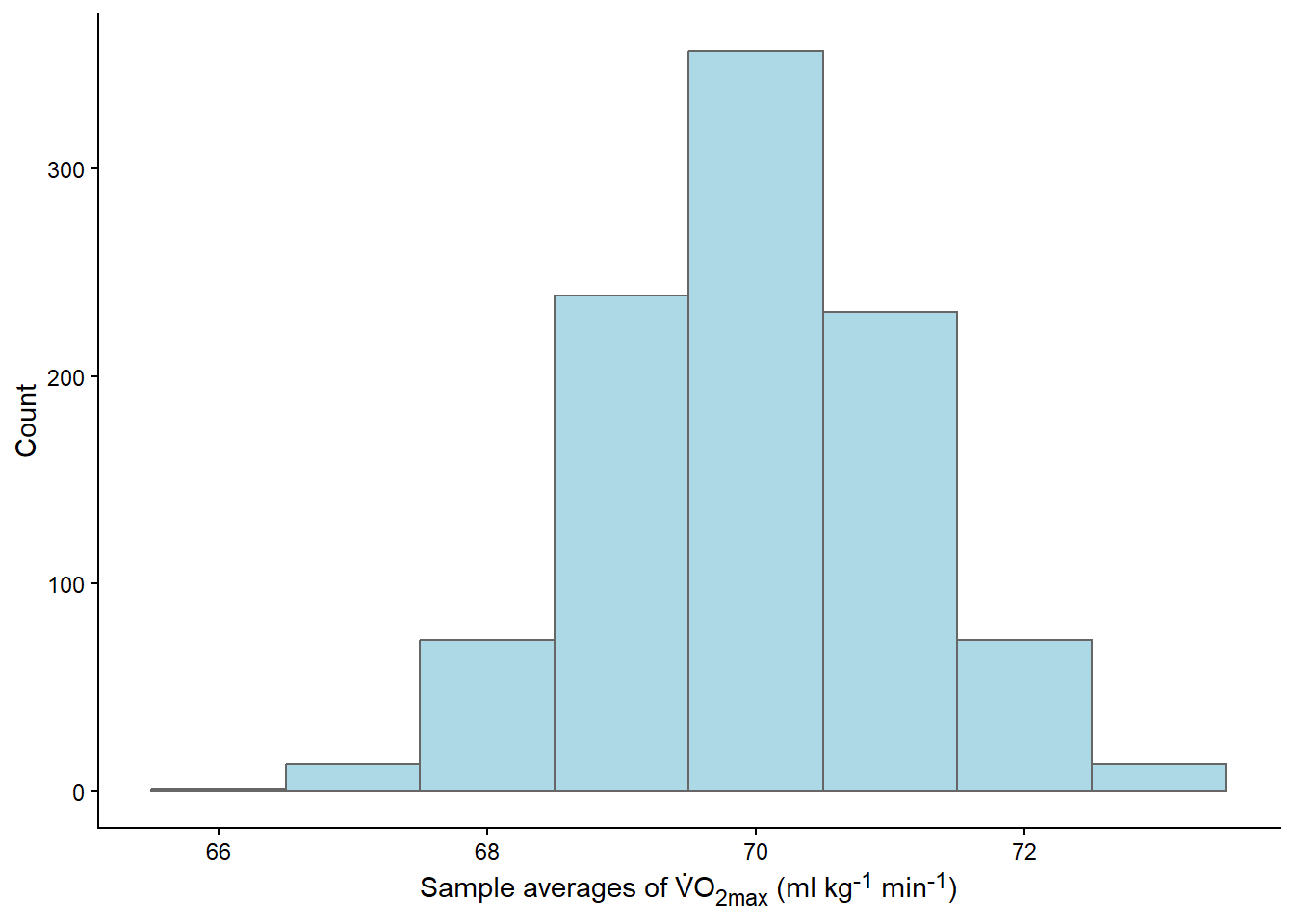 labs(x = "Sample averages of V̇O~2max~ (ml kg<sup>-1</sup> min<sup>-1</sup>)", y = "Count") +
