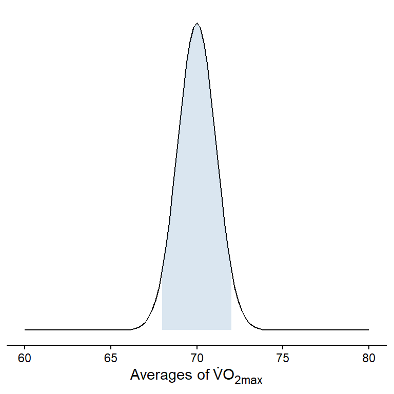 Let’s say that we collect data on VO2max values in trained cyclists (ml kg-1 min-1). We are interested in the average. First we simulate all possible values: