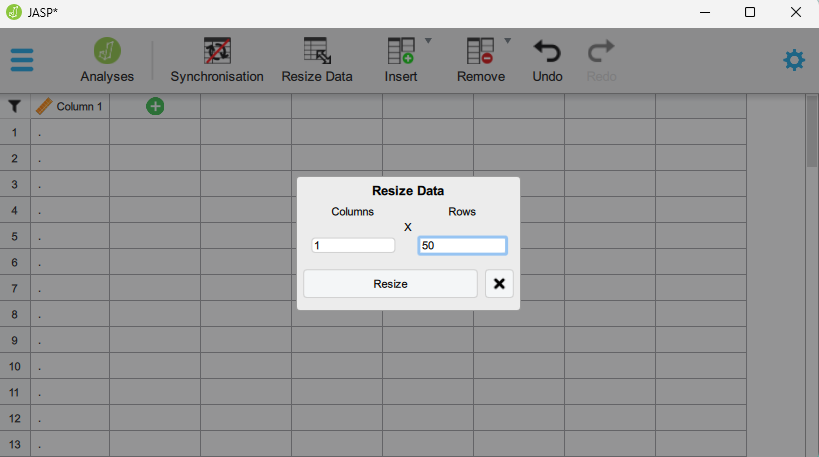 R and Jasp are great because you can simulate data! In the examples below we will generate data in R, you can copy and paste the code into your R session to run it and answer questions in this lesson. You can also follow along in Jasp. However, assignment of simulated data to variables in Jasp requires that you start by resizing the data set to the desired size (Figure 13.1).