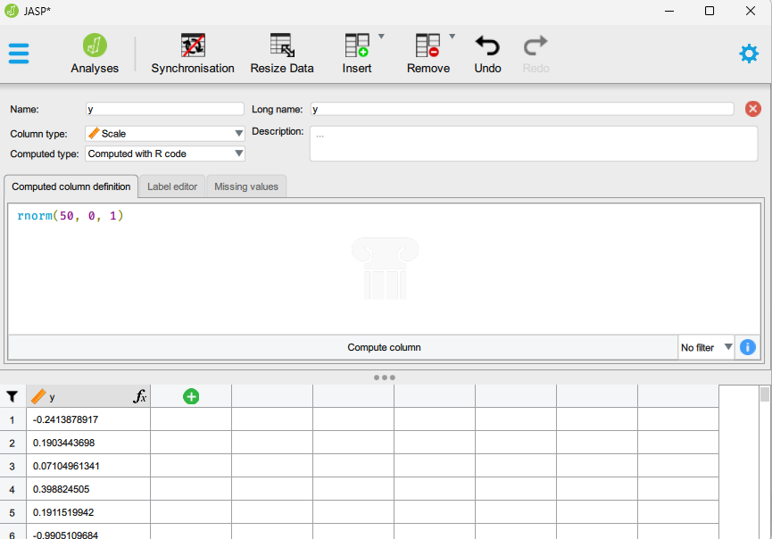 The assigniment operator (<-) makes y available in the environment as an object. Using Jasp we want to evaluate it directly to “record it” in the data set. The equivalent in Jasp should be: