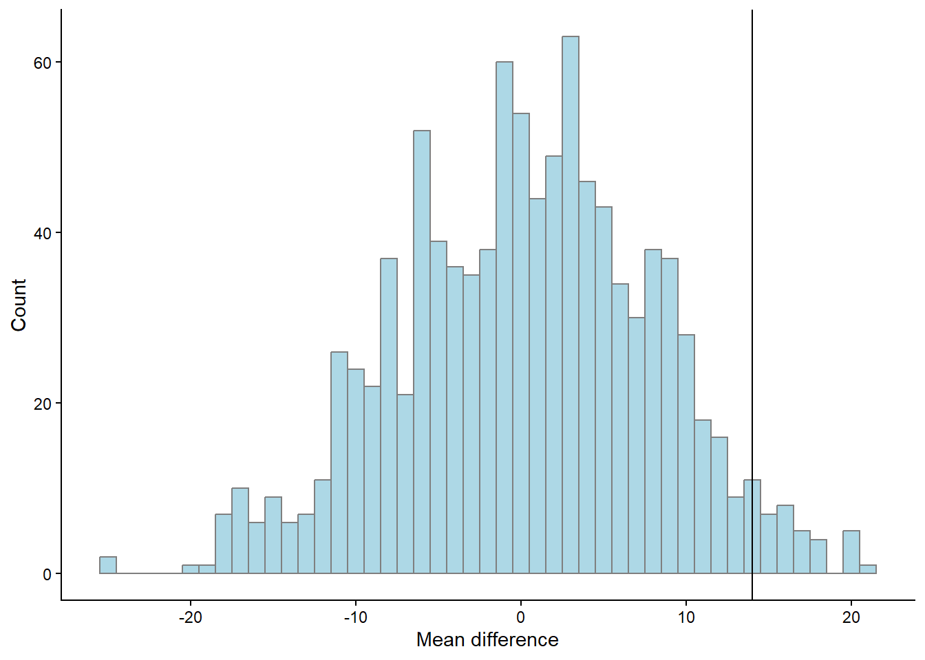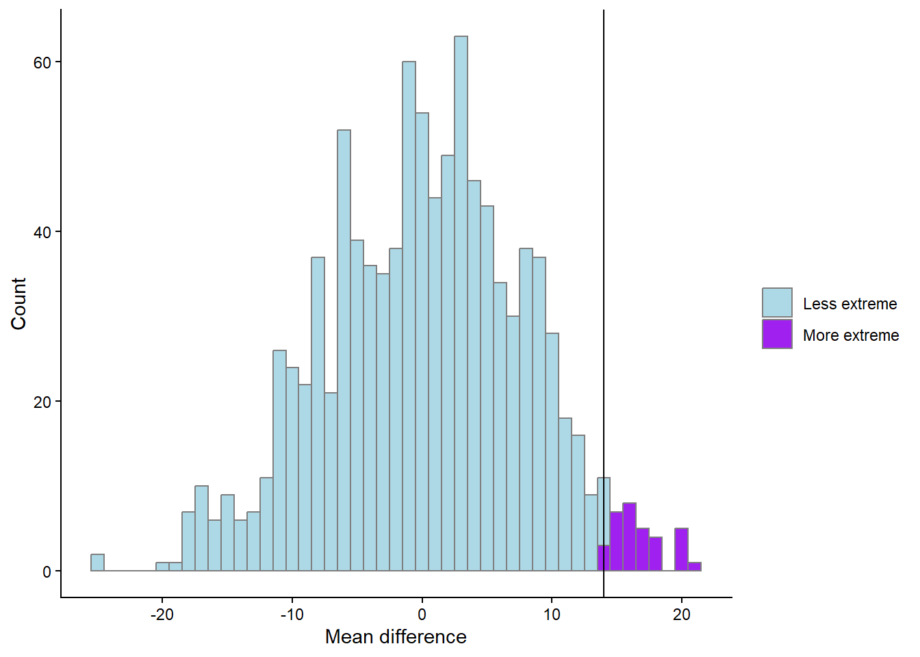 The graph above (Figure 14.5) show the distribution of reshuffled mean differences. As the reshuffle process was done 1000 times we can count the number of means more extreme than the mean that we did observe.