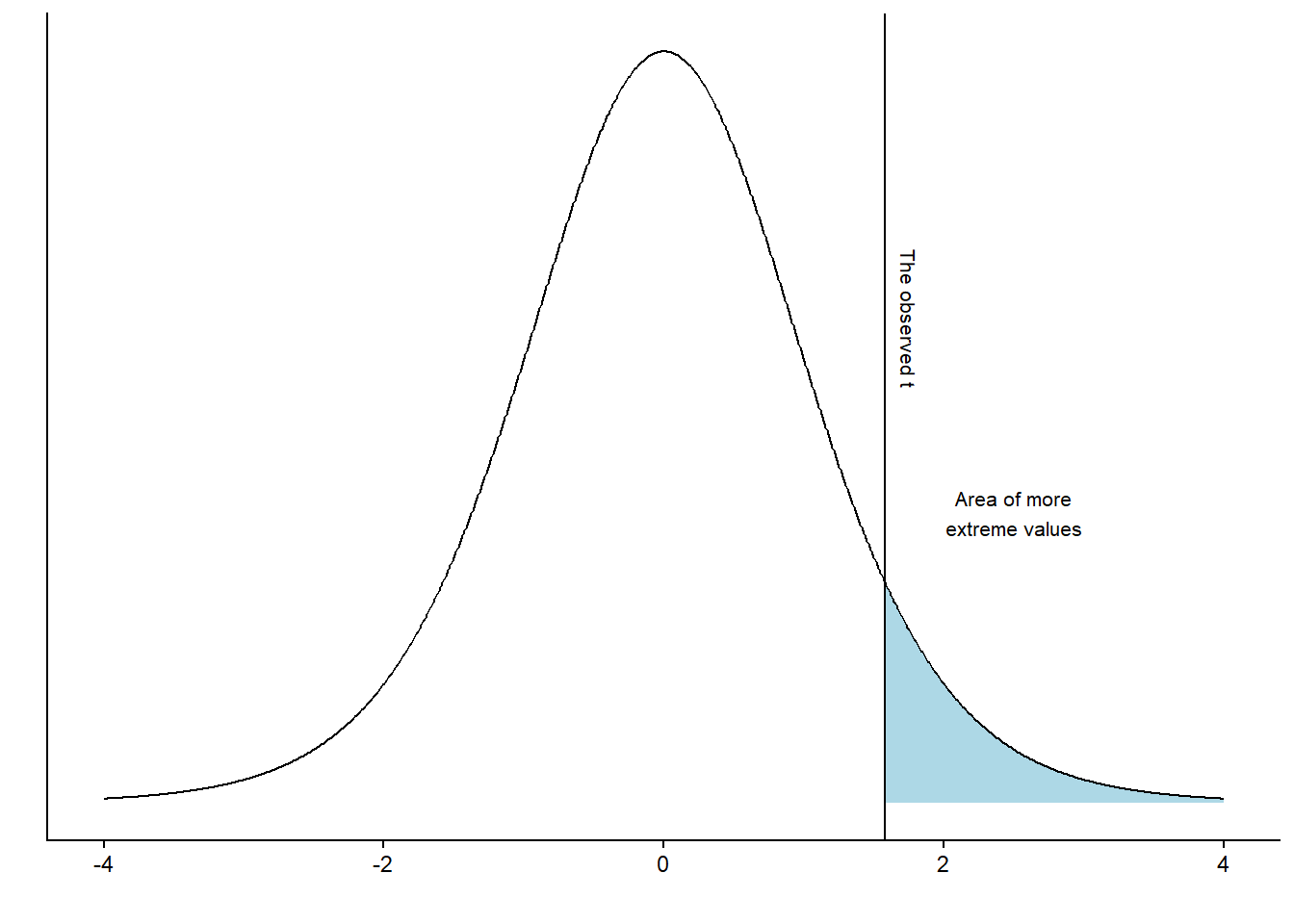 Using the calculated t-value, we may answer questions like: “If the null-hypothesis is true, how often would we observe our t-value, or an even more extreme value, if we repeated our study ?” We can calculate this from the imaginary distribution as the area under the curve above our value.