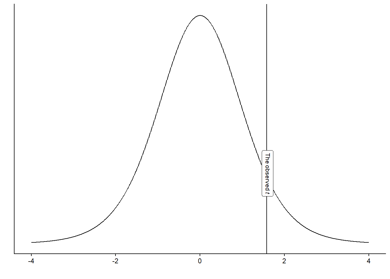 annotate("text", x = 1.75, y = 0.2, label = "The observed t", angle = -90,