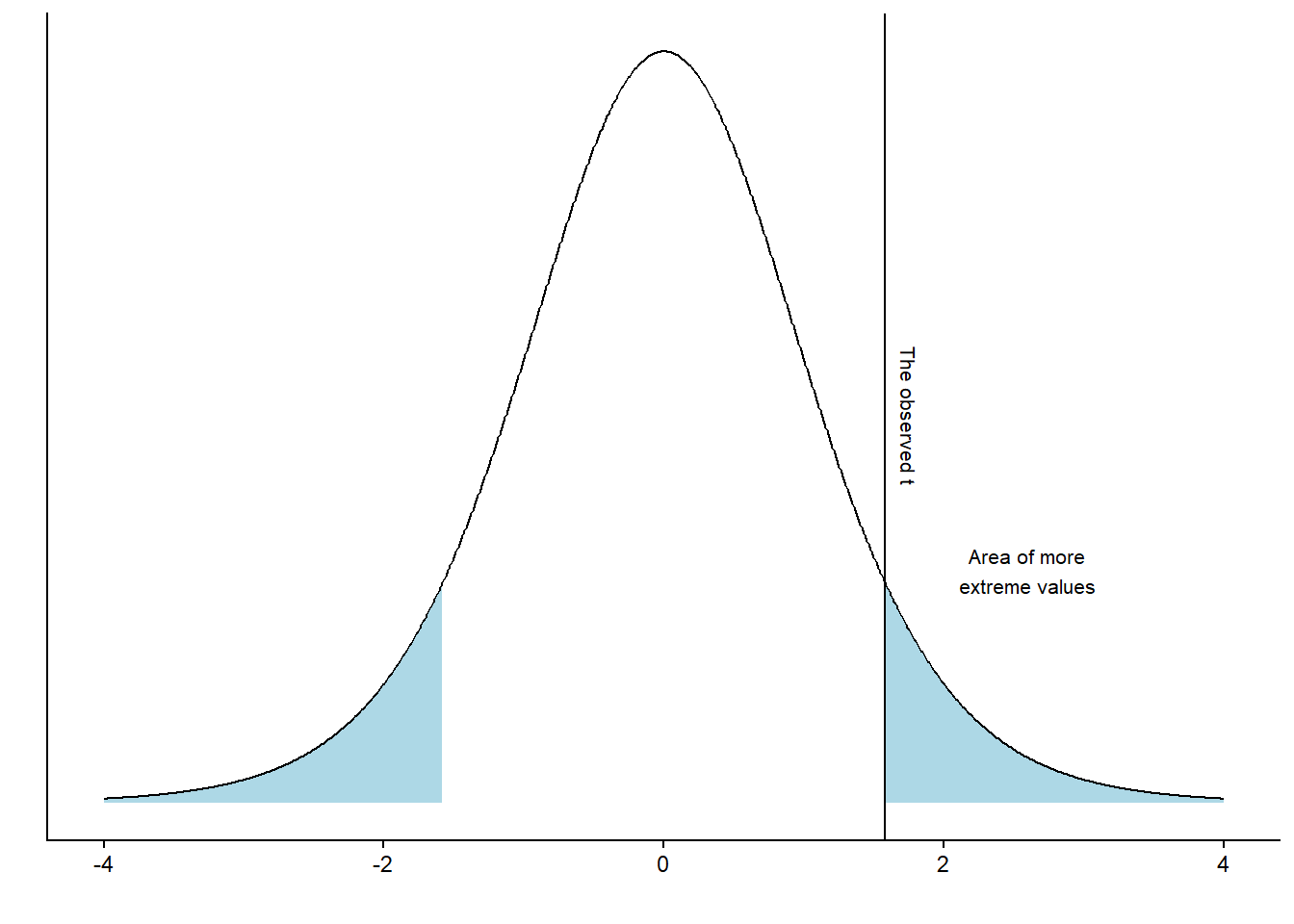 As the area under the curve in the blue area is 14.8% of the distribution we may make a statement such as: “If the null-hypothesis is true, our observed value, or a value even more distant from 0 would appear 14.8% of the times upon repeated sampling”.