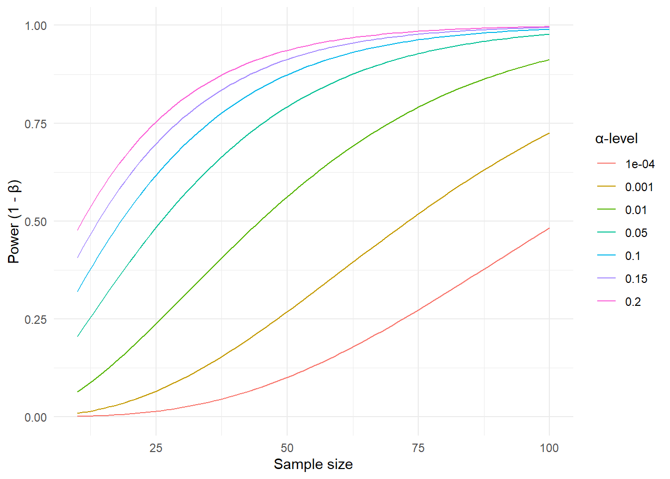 When designing a study, we want to balance the two types of errors. We are therefore interested in the number of participants (or replicates) required to achieve certain error rates. The power of a test, defined as the long-run chance of “detecting” a true alternative hypothesis, depends on the size of the effect in the alternative hypothesis, the number of participants in the study, and the \(\alpha\) level. In the figure below (Figure 15.1), we have plotted power values as a function of the sample size, given a fixed effect size of 0.4 (see below) and different values of the \(\alpha\) error rate ranging from 0.001 to 20%.