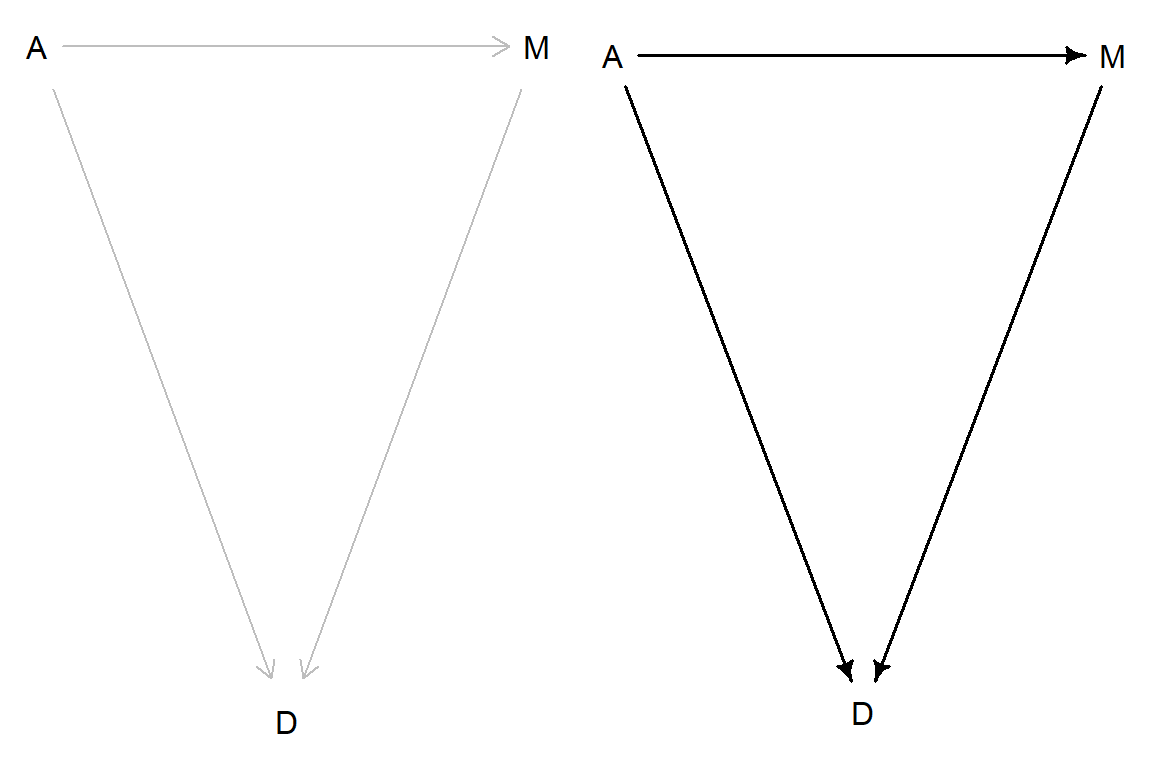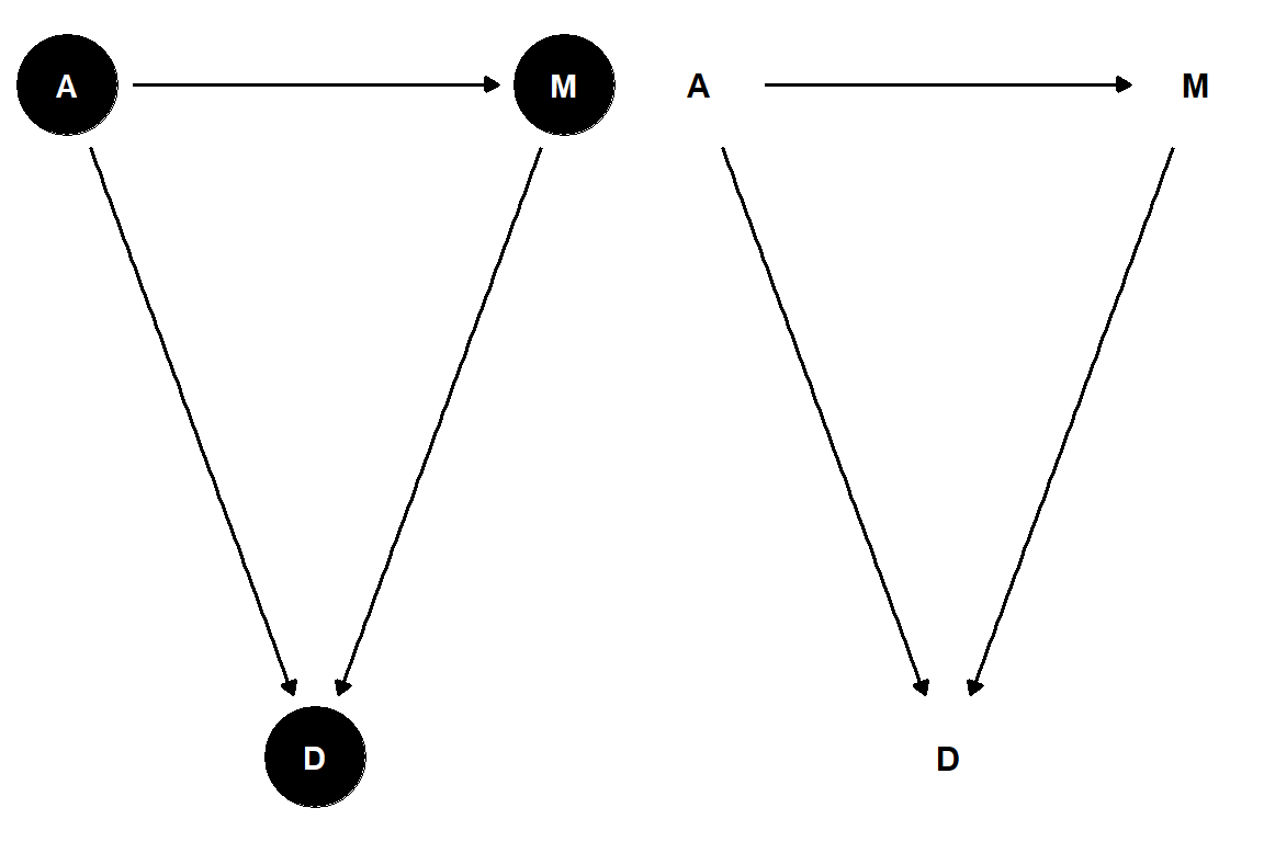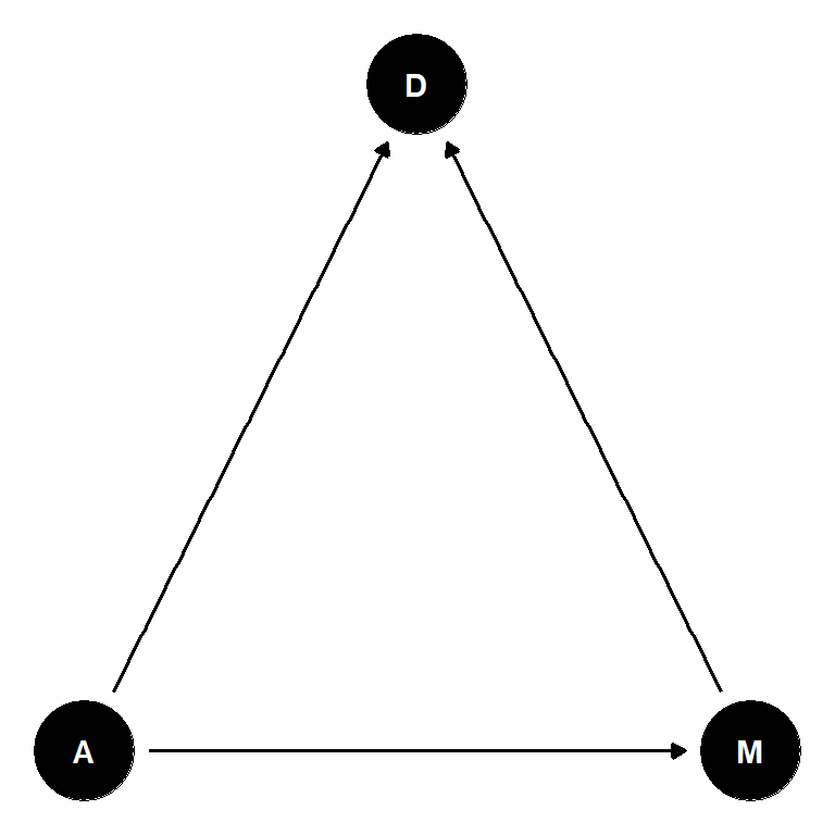 The arrows (edges) shows the (assumed) direction of the causal effect, variables (A, M and D; nodes).